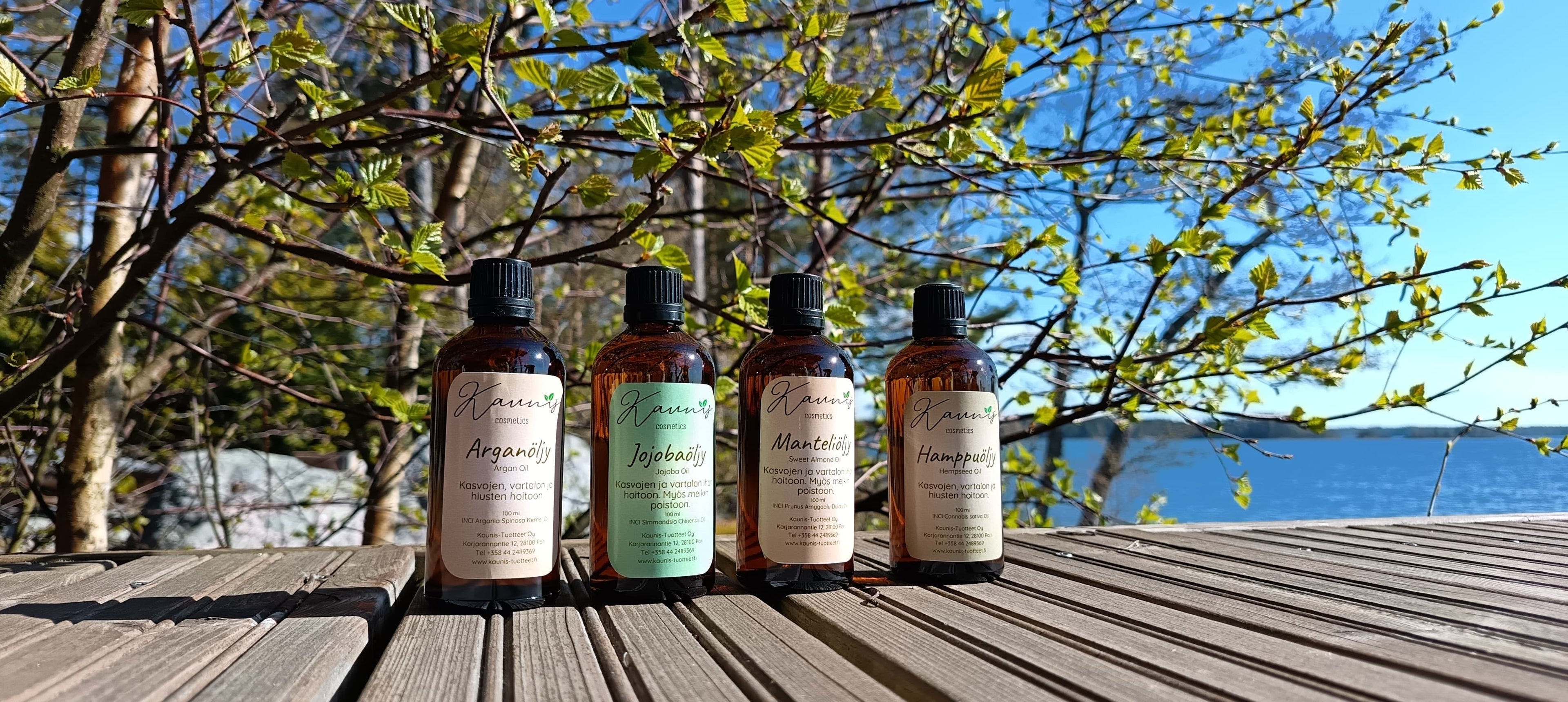 Kaunis Hoitoöljyt tarjoavat luonnollisen tavan pitää ihosi ja hiuksesi terveinä, ravittuina ja hyvinvoivina. Valikoimastamme löydät laadukkaat, 100 % luonnolliset öljyt eri tarpeisiin – jokaisella on omat ainutlaatuiset ominaisuutensa. Arganöljy kosteuttaa syvältä, silottaa ihoa ja tuo kiiltoa hiuksiin runsaan E-vitamiini- ja rasvahappopitoisuutensa ansiosta. Mieto ja hellävarainen manteliöljy sopii erityisesti kuivalle ja herkälle iholle sekä rauhoittavaksi hierontaöljyksi. Hamppuöljy tasapainottaa ja lievittää ihoärsytyksiä, imeytyy nopeasti ja toimii erinomaisesti myös partaöljynä. Jojobaöljy puolestaan jäljittelee ihon omaa talia, tasapainottaa rasvaista ihoa ja tuo helpotusta kuivaan hiuspohjaan. Kaunis Hoitoöljyt ovat monikäyttöisiä, tehokkaita ja puhtaita tuotteita, joilla hemmottelet itseäsi luonnollisesti – päästä varpaisiin.