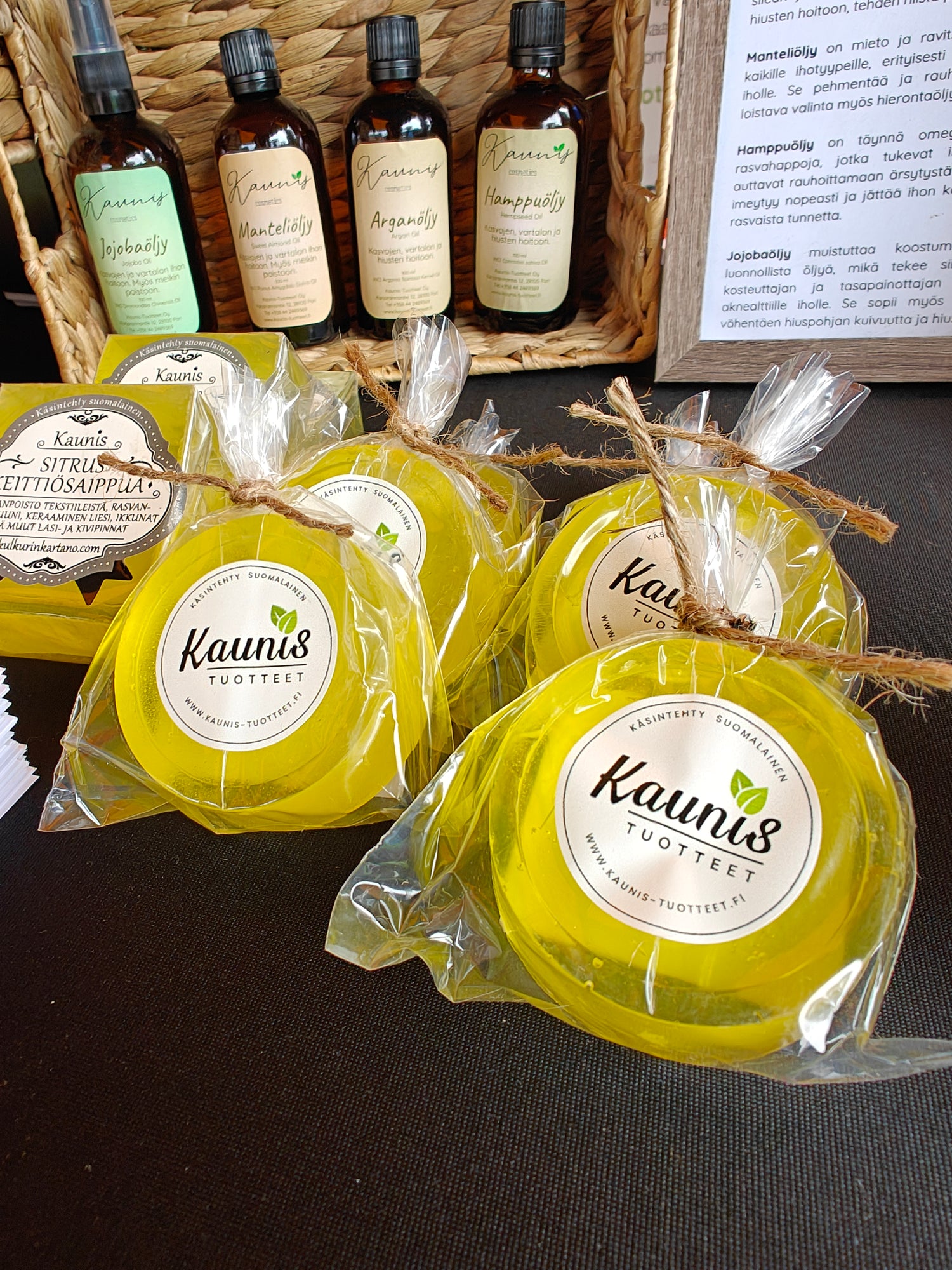 Kaunis Siivoussaippuat tekevät kodin puhdistamisesta tehokasta, ekologista ja samalla miellyttävän tuoksuista. Nämä monikäyttöiset palasaippuat soveltuvat esimerkiksi keittiön, kylpyhuoneen ja pintojen puhdistukseen – jopa tahranpoistoon pyykistä. Luonnollisista raaka-aineista valmistetut siivoussaippuat ovat hellävaraisia sekä ympäristölle että käyttäjälle, mutta silti tehokkaita lian ja rasvan irrottajia. Ne vaahtoavat hyvin, riittävät pitkään ja tuovat puhdistukseen ihanaa käsintehdyn tuotteen tuntua. Kaunis Siivoussaippua on täydellinen valinta sinulle, joka haluat siivota luonnollisesti, kauniisti ja vastuullisesti – ilman turhia kemikaaleja tai muovia.